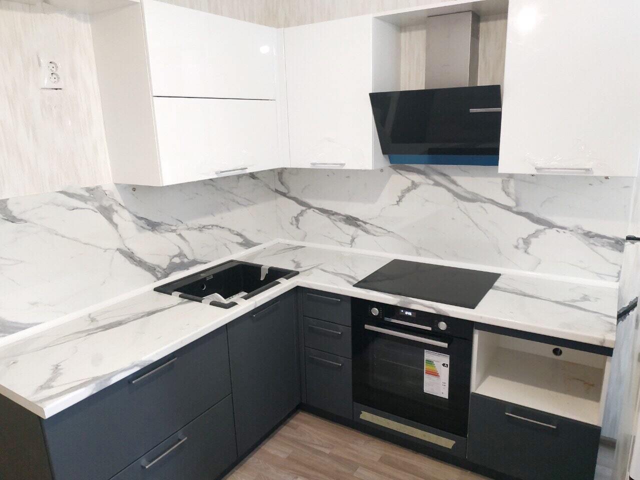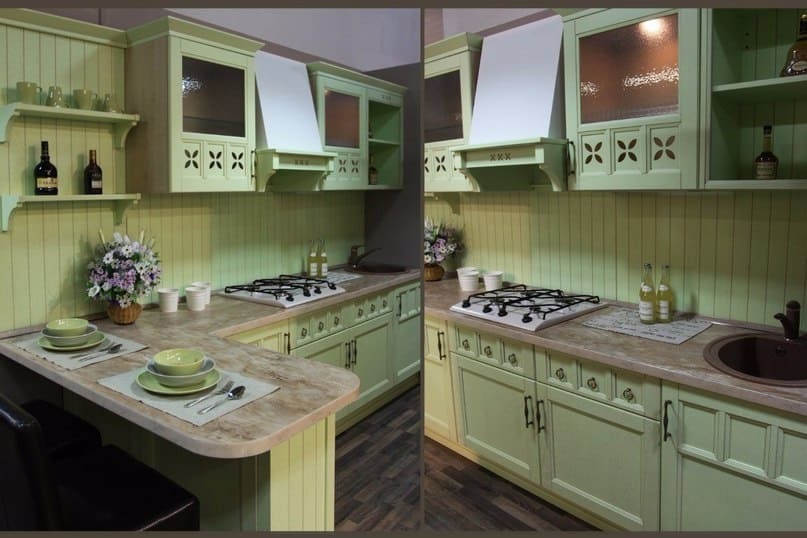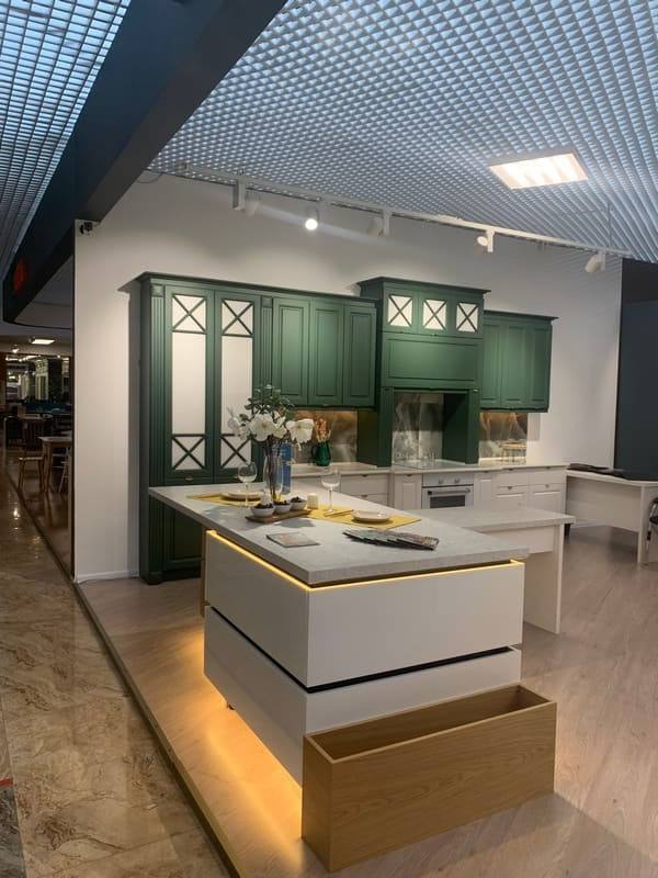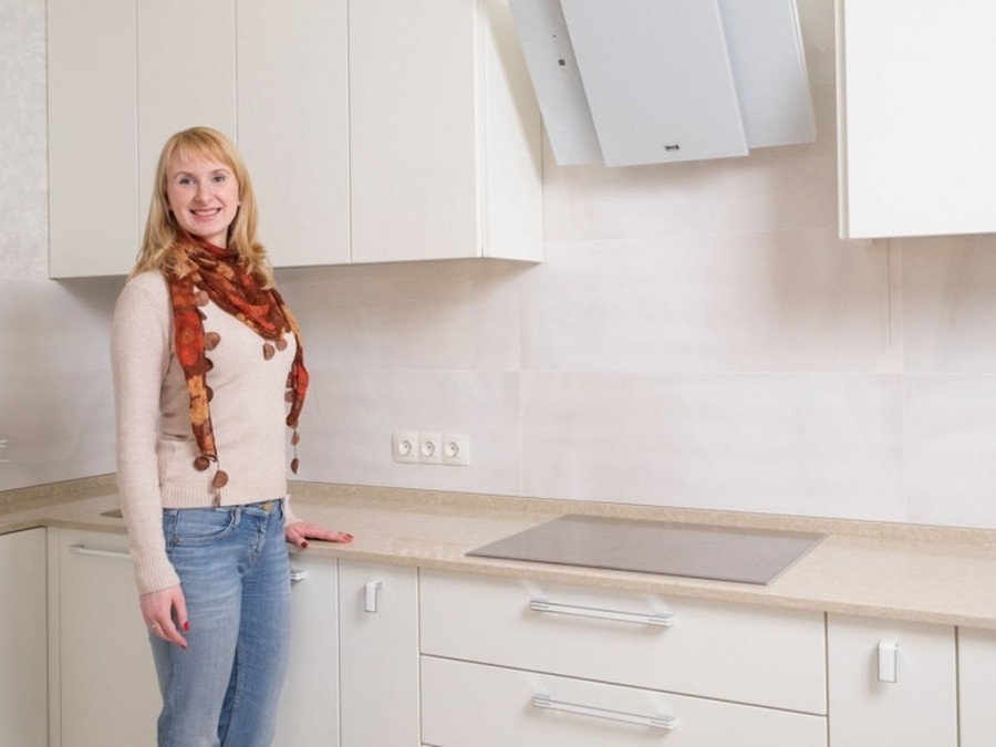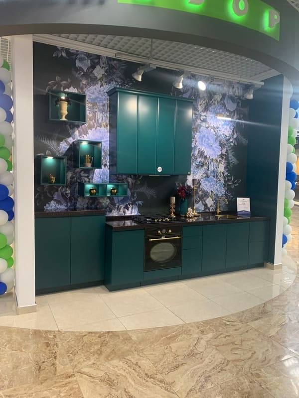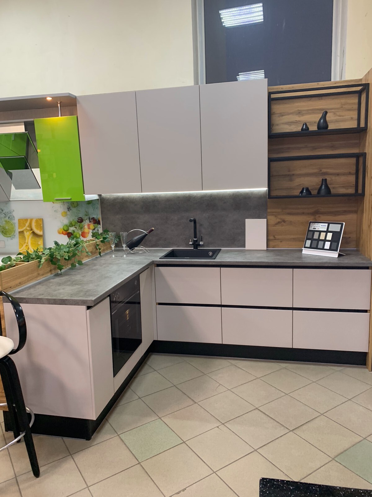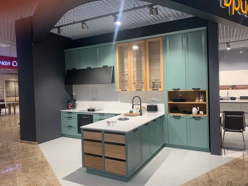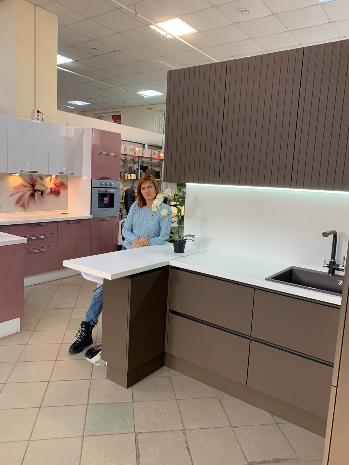 Выбрать из большого ассортимента образцы кухонных фасадов, корпусных деталей, столешниц, фартуков, смесителей, ручек (при необходимости);