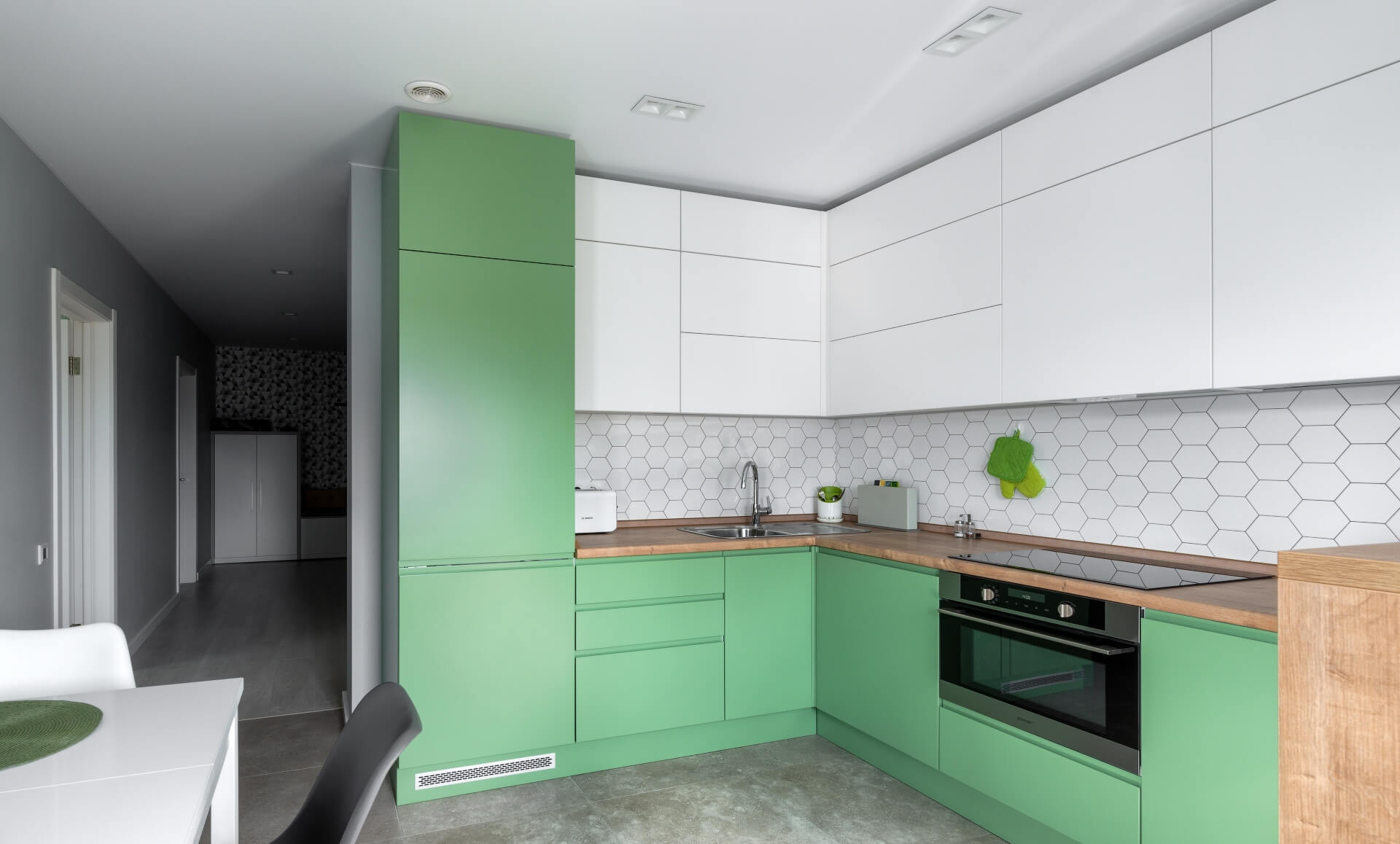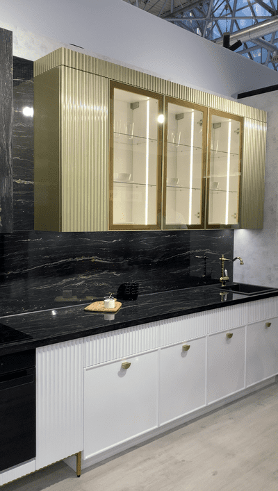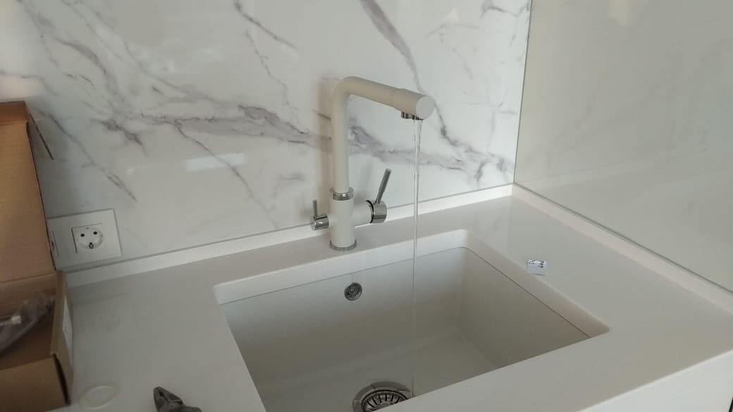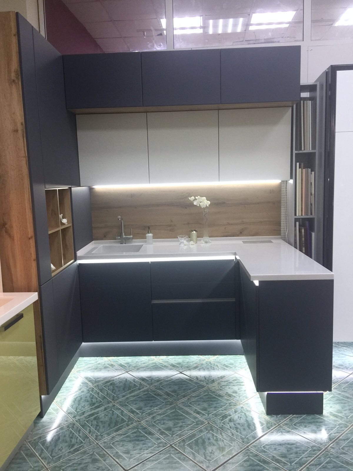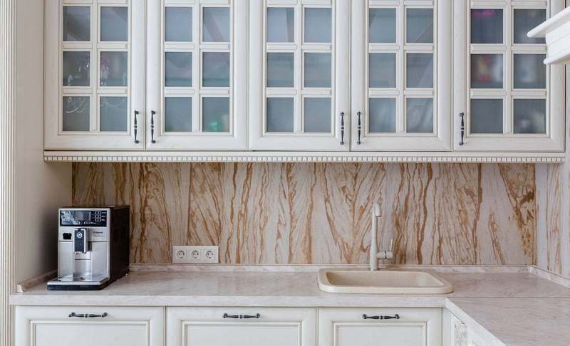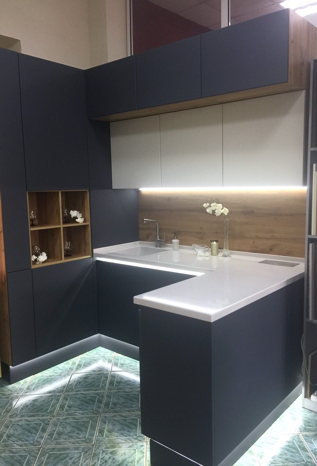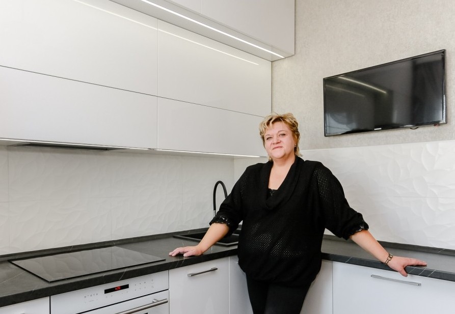 Выбрать из большого ассортимента образцы кухонных фасадов, корпусных деталей, столешниц, фартуков, смесителей, ручек (при необходимости);